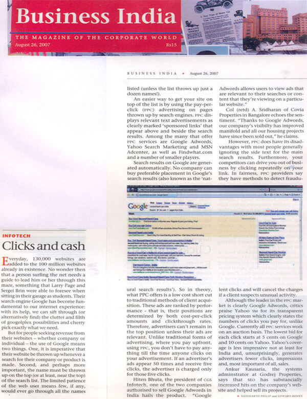 In a news clipping from Business India Magazine, an article entitled “Clicks and Cash” features a quotation from the CGS Infotech president at a time when our company was one of only two in India authorized to sell Google Adwords. It shows how CGS Infotech has always been an industry leader. That’s how the company is able to provide great results to businesses of all kinds that want better search engine ranking through expert SEO services.